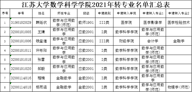 根据《江苏大学本科生转专业实施办法》(江大校【2018】10号)、《关于做好2021年本科生转专业工作的通知》(江大教〔2021〕71号)等文件精神,经个人申报、澳門漁人碼頭 审核,现将符合条件的同学公示如下: