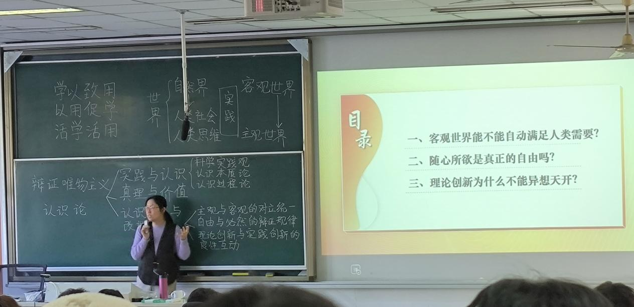 李珂老师在《马克思主义基本原理》课程教学中,讲授了“辩证唯物主义认识论”这一主题。李珂老师通过课前学生对“我心中的南京长江大桥”的分组实践讲述了实践与认识的关系、主观与客观的对立统一、自由与必然的辩证关系,理论创新与实践创新的良性互动等问题,展现了人的实践活动与认识活动的密切关联。