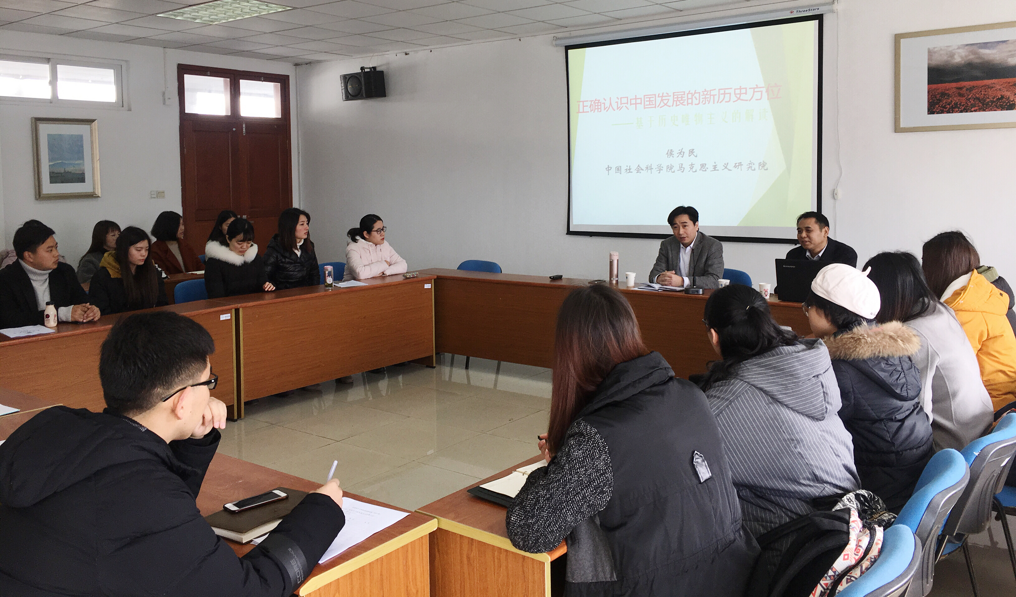 梅景辉院长在总结时指出,侯为民研究员从历史唯物主义的角度,多维度地分析了中国发展的新历史方位,讲座内容体现了学术思想与政治宣讲的深度融合;理论逻辑与历史逻辑的深度融合;经典文本、经典思想、经典案例、经典话语四个方面的深度融合。他寄语在场研究生,希望大家通过聆听本次讲座,既要深刻理解中国宏观发展的新时代,也要准确把握自身微观生活的新时代,要在砥砺奋进的大环境中准确定位,融入时代,奋发有为,力求彰显卓越、超越自我,争做新时代的优秀好青年。