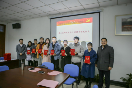 领导及老师为第六届研究生会的全体成员颁发聘书,并为2018-2019年度优秀研究生干部以及“庆祝新中国成立70周年”征文比赛的获奖人员颁发了荣誉证书。