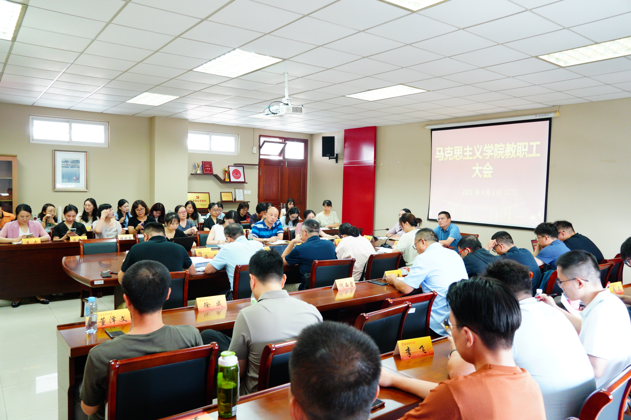 在德正楼508会议室召开新学期全体教职工大会。会议由院党委书记陈翔主持。