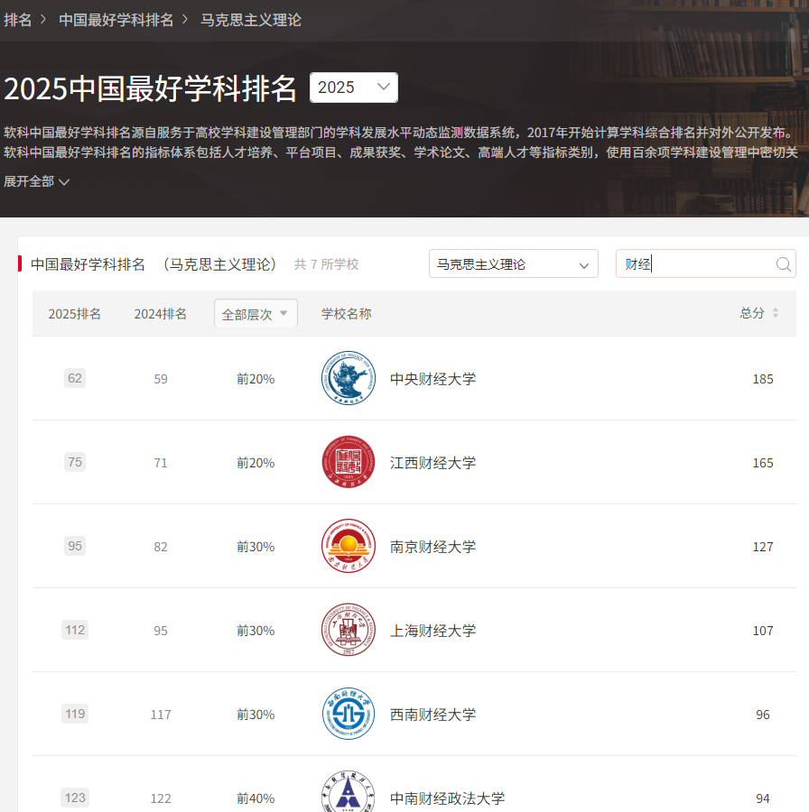 马克思主义理论学科等级为B(全国前30%),在全国高校中排名第95,在全国财经类高校中排名第4。