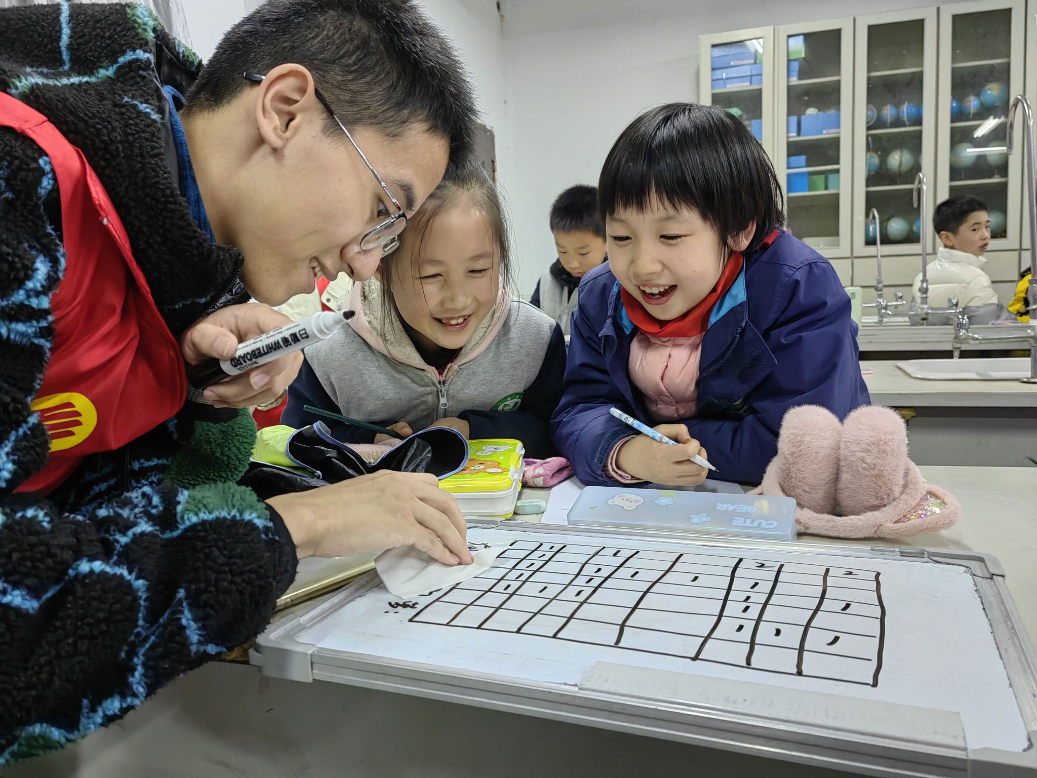 志愿者们将在场的小朋友们每两个分为一组,每组有一到两个成员参与教学,同时将已准备好的教案分发给每个小朋友。志愿者首先通过情景导入,通过解开由数字1、2组成的山门密码,带领小朋友探索其中的数学排列知识,再运用交换法、固定法等问题,循序渐进,引导小朋友将抽象思维转换成简单问题。再在志愿者带领下,小朋友用语言描述数字排列的过程与思考,逐步掌握数学广角-排列中的数字交换法与固定法。在小朋友初步学会简单的数学排列题目后,志愿者先让小朋友独立地用两种方法解决相似问题,随后带领他们尝试难度逐渐增加的题目从而感受其中的推理思想,培养小朋友们的逻辑推理能力,最后在完成拓展延伸模块后,本次志愿活动圆满结束。