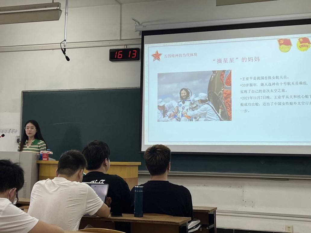 牛贺欣从“五四精神的核心内容”“五四精神的内涵”“四精神的当代体现”三个方面进行宣讲,带领同学们重温五四精神丰富的精神内核。通过介绍王亚平、苏翊鸣、珠峰高程测量登山队等英雄人物事迹,诠释新时代下五四精神的新表现、新内容。最后,牛贺欣以“当代青年如何继承五四精神”为出发点,将思考拉回到每一位同学身上,并提醒大家,“青年,要自信,要果敢,要有一月看尽长安花的意气风发,要有少年负壮气,奋烈自有时的豪情。”