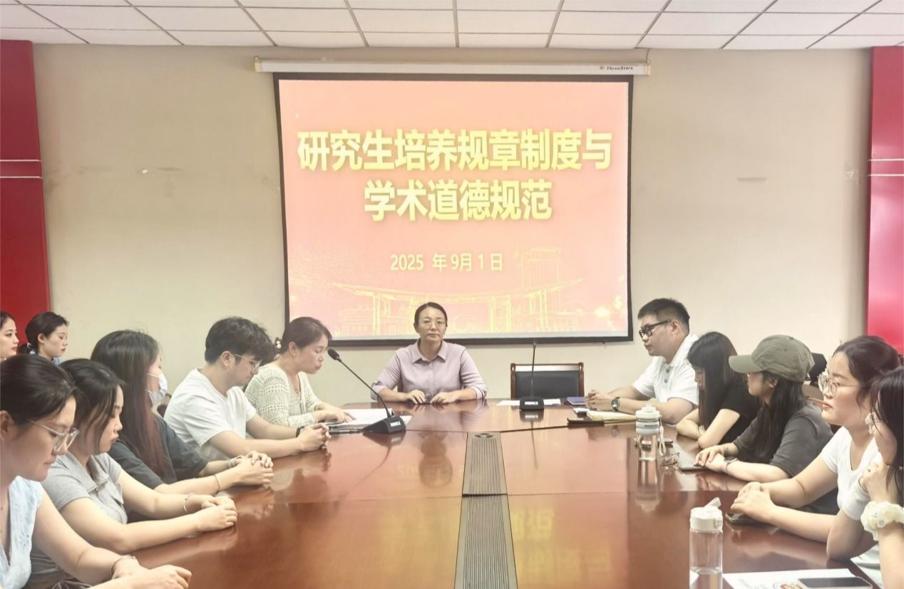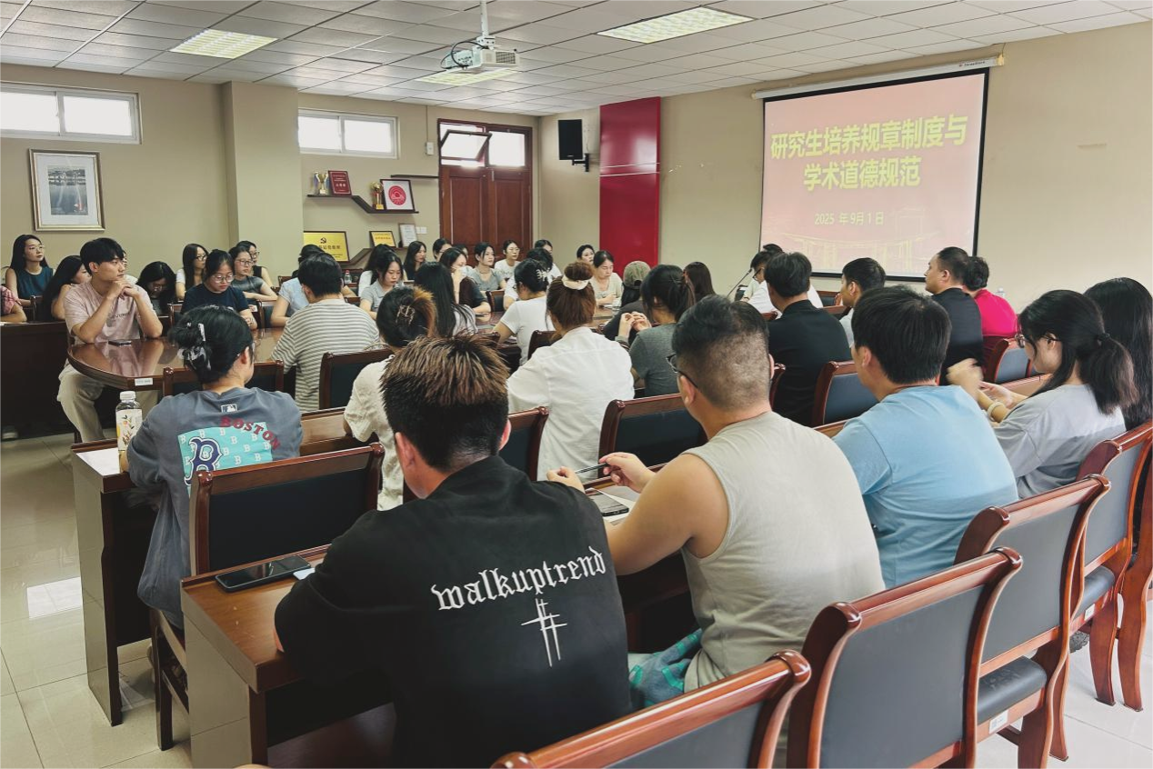 在德正楼508会议室召开2025级研究生培养规章制度与学术道德规范会议,院长卓承芳教授、副院长解兆丹、研究生辅导员王晶、研究生秘书张妍、院研究生会干部以及2025级全体新生参加会议。本次会议由副院长解兆丹主持。
