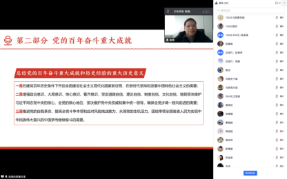 陈翔书记以“深入学习贯彻党的十九届六中全会的主要精神”为题,深刻论述了党的百年奋斗重大成就和历史经验。首先,陈翔书记从国内和国际两个大局介绍了党的十九届六中全会主要成就和历史意义。其次,陈翔书记从历史和现实两个向度重点阐述了党带领人民团结奋斗的四个不同历史时期,运用生动的历史事件和典型事例表明中国目前的发展,同时,陈翔书记紧密联系研究生的实际,鼓励研究生要立足于中国实际,做好学术研究。