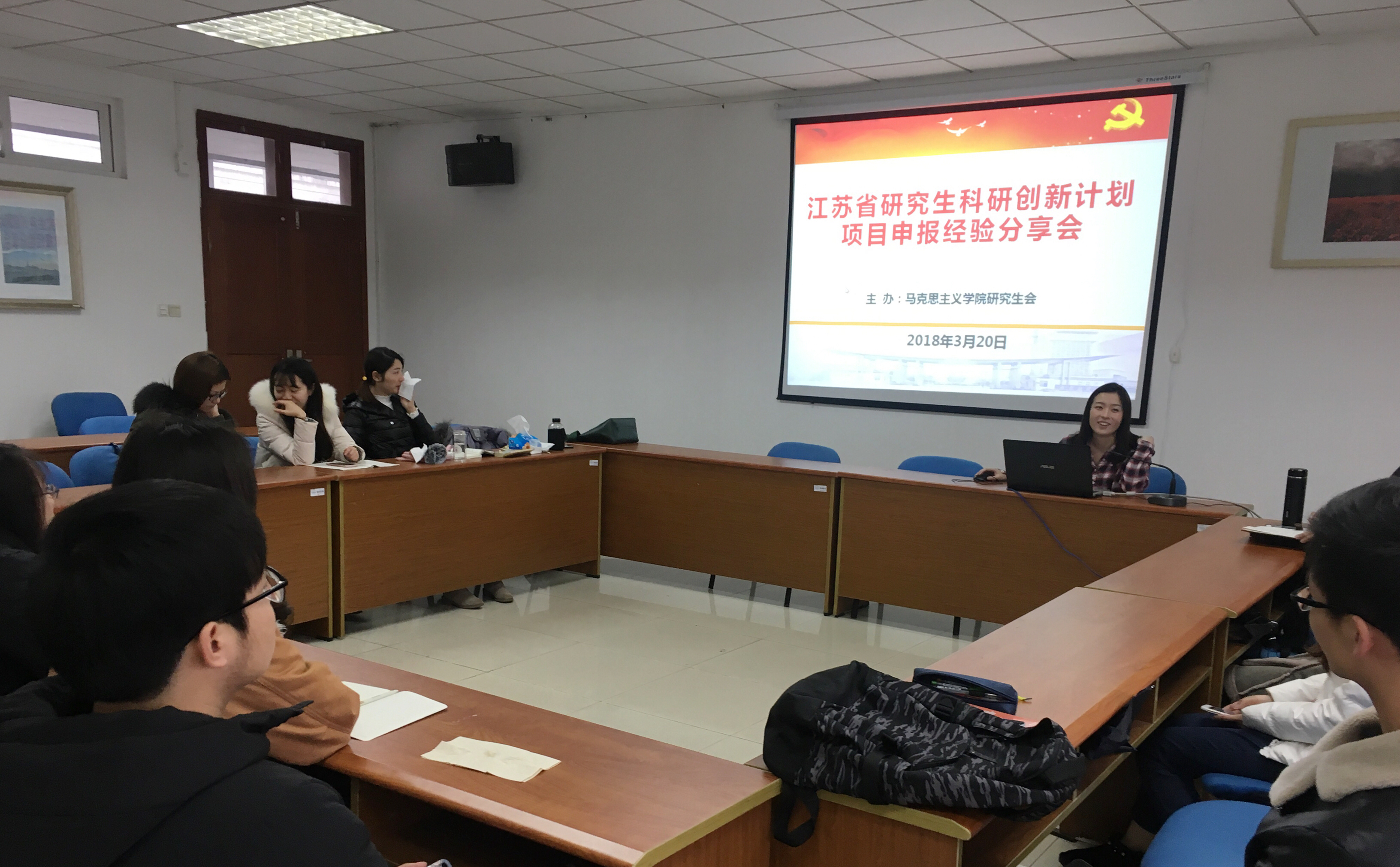 会议室举办了“2018年度江苏省研究生科研创新计划项目”申报经验分享会。会议邀请2016级成功申报省立省助项目的莫菲、彭见欢、彭婷、屈文锦四位同学担任主讲,2017级意向申报省级课题的同学参加了会议,会议由澳門漁人碼頭