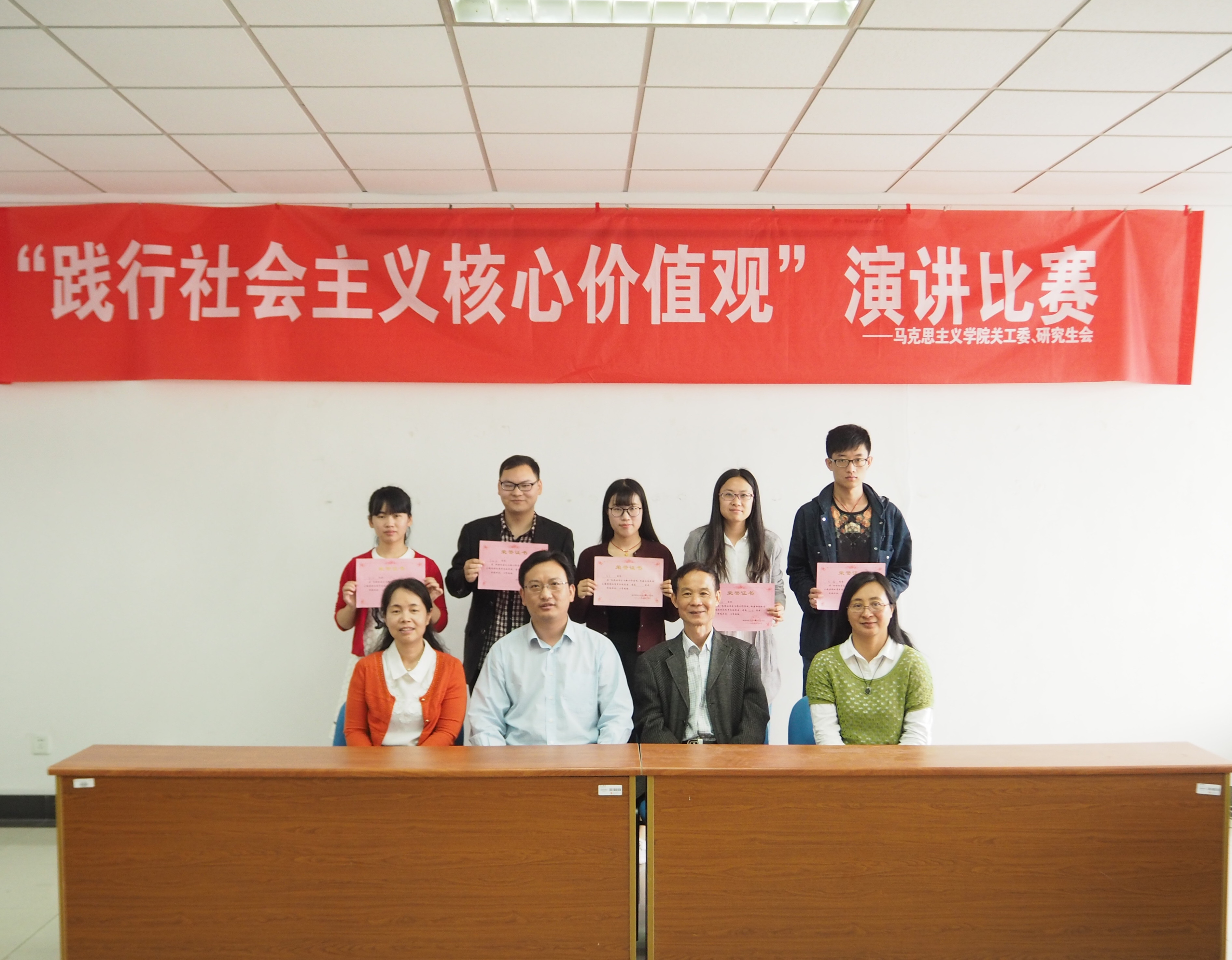 经过宣传报名、审核稿件、初选人员等环节,共有5名选手进入了决赛。选手们的演讲慷慨激昂、热情洋溢。选手们结合自己的实际生活,分别从校园环境建设、师生和谐相处、修身养性等方面对弘扬社会主义核心价值观、构建和谐校园畅谈了自己的看法。尤其是2015级研究生季莹同学的演讲,声情并茂,配以得体的肢体语言,更显精彩,最终赢得了本次比赛的一等奖,陈朋、冒林波两位同学分获二、三等奖。
