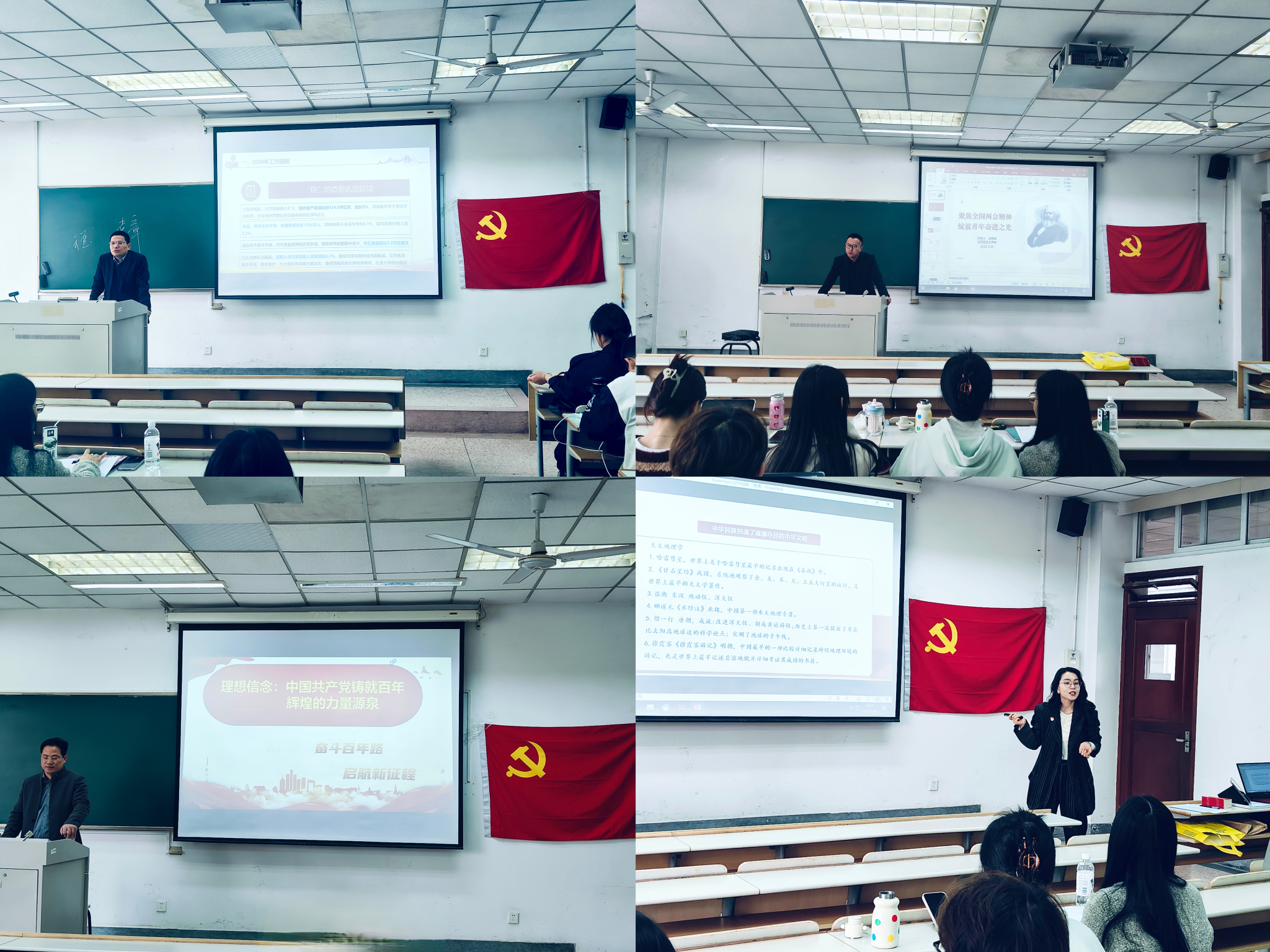 陈翔书记以“学习贯彻2025年全国两会精神”为题,深入解读了两会精神的核心要义和实践要求。徐梓彦老师以“聚焦全国两会精神,绽放青年之光”为题,论述了新时代青年应当以两会精神为指引,积极履行社会责任,充分先锋作用,实现个人价值与社会价值的统一。李飞老师以“理想信念:中国共产党铸就百年辉煌的力量源泉”为题,深刻阐述了中国共产党如何带领人民群众在风雨兼程中开辟伟大道路、创造伟大事业、取得伟大成就。黄继红老师以“中国共产党与中华民族伟大复兴的中国梦”为题,回顾中华民族的发展历程。